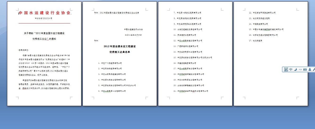 喜訊:我公司榮獲2012年度全國水運工程建設