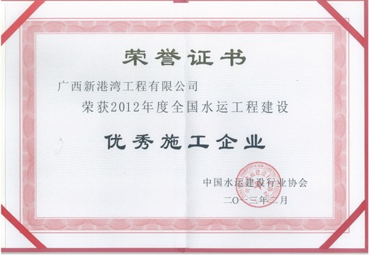 根據中國水運建設行業(yè)協(xié)會(huì )文件,中水協(xié)字[2013]24號《關(guān)于表彰“2012年度全國水運工程建設優(yōu)秀施工企業(yè) ”的通知》,2012年全國水運工程優(yōu)秀施工企業(yè)的評選工作己經(jīng)結束。經(jīng)審定,共有包括廣西新港灣工程有限公司在內的二十七家企業(yè)榮獲“2012年度全國水運工程建設優(yōu)秀施工企業(yè)”稱(chēng)號。
