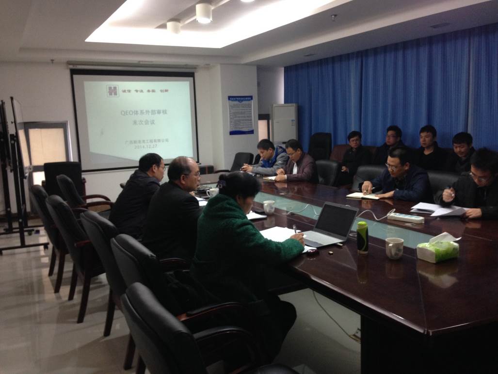 會(huì )上,由方圓標志認證集團審核專(zhuān)家組組長(cháng)龐高舉公布了此次審核的結果:廣西新港灣工程有限公司順利通過(guò)ISO9001(質(zhì)量管理體系)、GB/T50430(工程建設施工企業(yè)質(zhì)量管理規范)、ISO14001(環(huán)境管理體系)、OHSAS18001(職業(yè)健康安全管理體系)4體系第二次監督認證審核,認證體系證書(shū)持續有效。