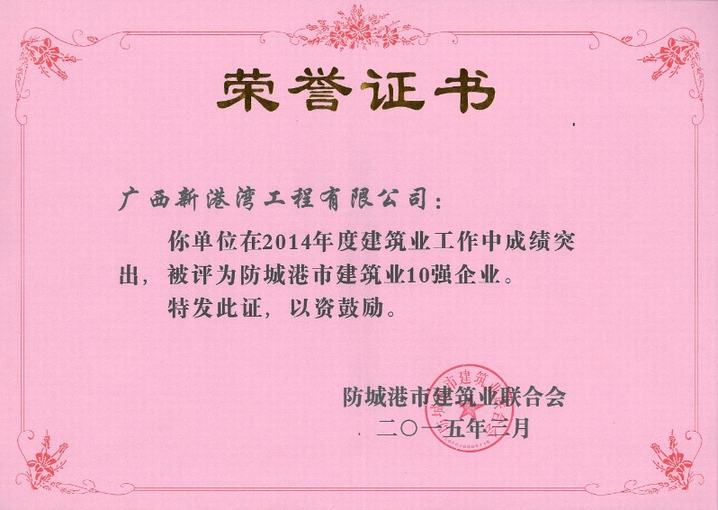 2015年3月,防城港市建筑業(yè)聯(lián)合會(huì )發(fā)布了“2014年度防城港市建筑業(yè)10強企業(yè)”獲獎名單。