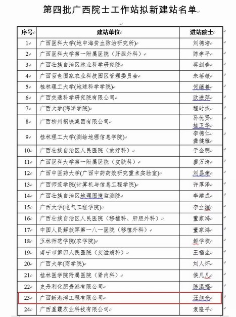 近日,在廣西科學(xué)技術(shù)廳官方網(wǎng)站上公示了本年度第四批廣西院士工作站新建名單,同意包括廣西新港灣工程有限公司在內的24家單位設立院士工作站。